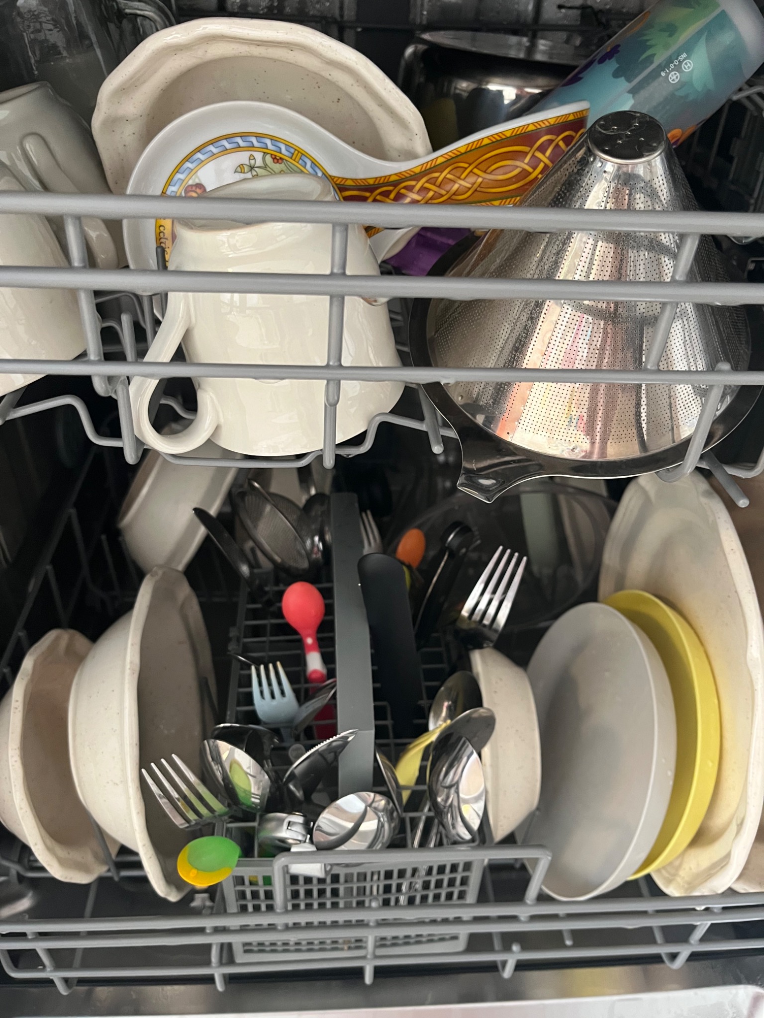 After a past mishap where a plastic spatula slipped down, caught at the bottom of the dishwasher, and overheated — releasing fumes I never want to experience again — I stopped using the heat-dry setting entirely. I don’t know the science behind it, but running this powder on an eco cycle, without heat dry, my dishes still come out dry once the door is cracked open.