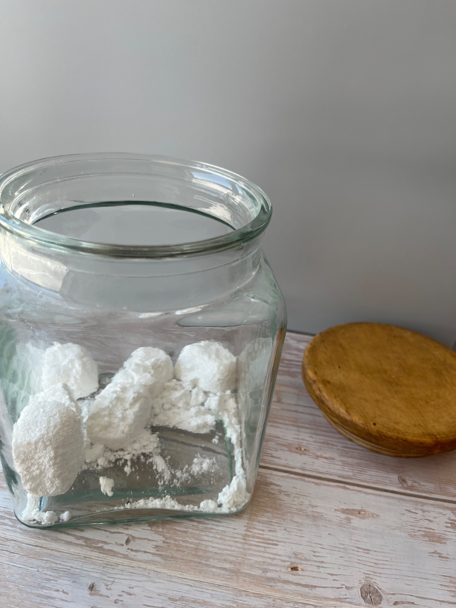 For now, the powder sits inside a sealed zip-lock bag, which then lives inside a glass jar with a looser lid. It isn’t beautiful, but it works. The extra layer keeps humidity out, and the powder stays dry and free-flowing.